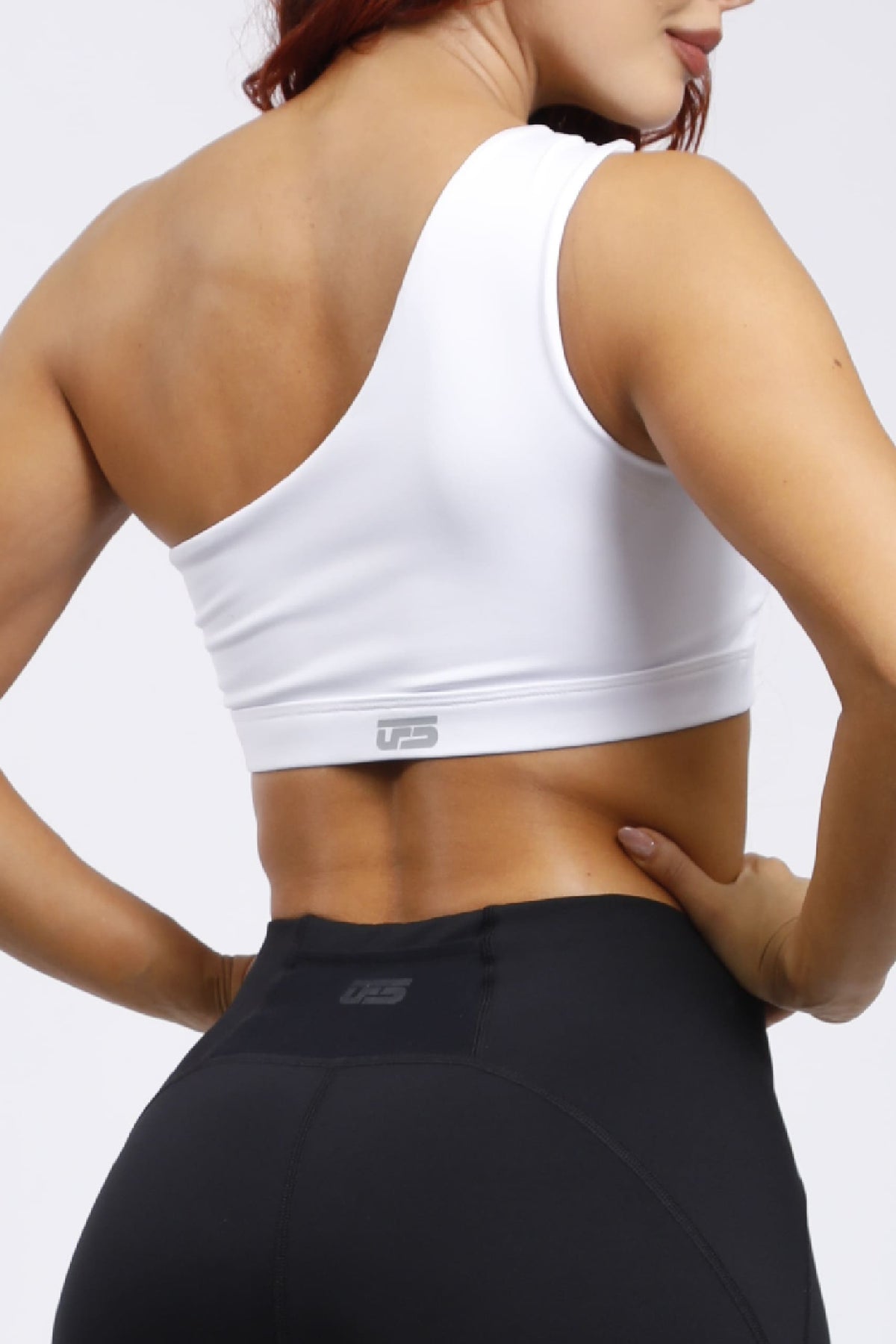 Top en microfibra con diseño asimétrico de un solo hombro con abertura frontal y elástico inferior que asegura ajuste firme durante la actividad física. La espalda mantiene una cobertura amplia para mayor estabilidad.
